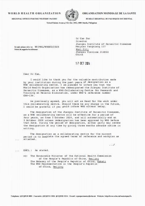 近日,世界衛生組織(WHO)西太區致函我所,正式確認我所續任WHO消除瘧疾研究與培訓合作中心。目前,我所WHO消除瘧疾研究與培訓合作中心進入第三屆任期,任期至2028年10月3日。