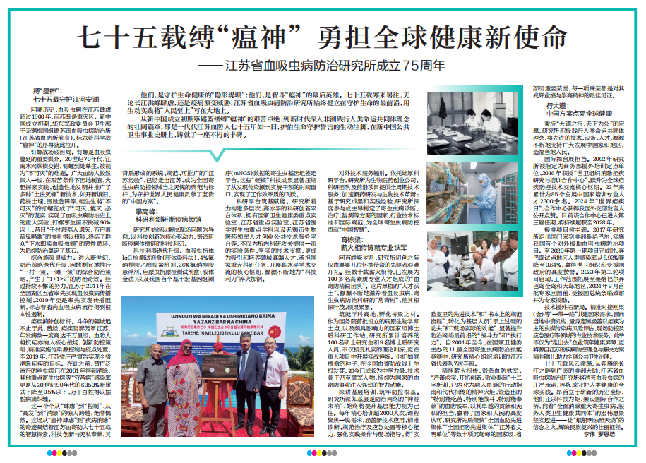 今天(7月30日),《新華日報》在顯著位置刊發專題文章,紀念江蘇省血吸蟲病防治研究所成立75周年!深情回顧了我所七十五載風雨兼程、矢志不渝 的奮斗歷程。