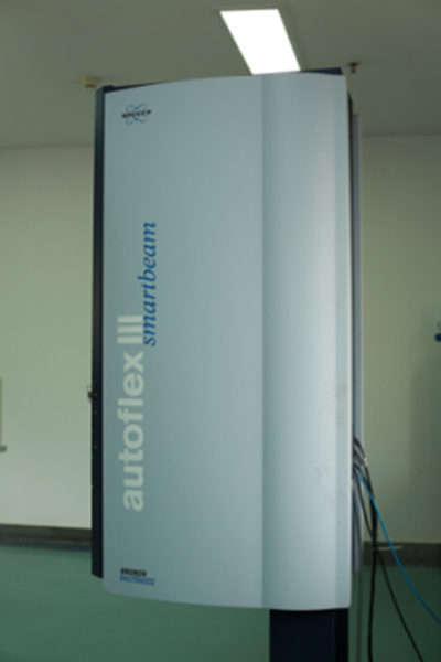 型號:autoflex speed MALDI-TOF-MS。儀器主要由兩部分組成:基質附助激光解吸電離離子源(MALDI)和飛行時間質量分析器(TOF)。MALDI的原理是用激光照射樣品與基質形成的共結晶薄膜,基質從激光中吸收能量傳遞給生物分子,而電離過程中將質子轉移到生物分子或從生物分子得到質子,而使生物分子電離的過程。因此它是一種軟電離技術,適用于混合物及生物大分子的測定。TOF的原理是離子在電場作用下加速飛過飛行管道,根據到達檢測器的飛行時間不同而被檢測即測定離子的質荷比(M/Z)與離子的飛行時間成正比,檢測離子。可用于分子量測定,蛋白質鑒定等。