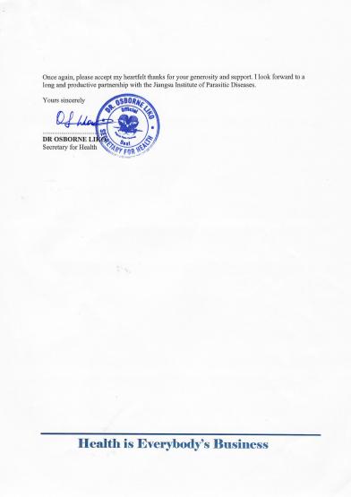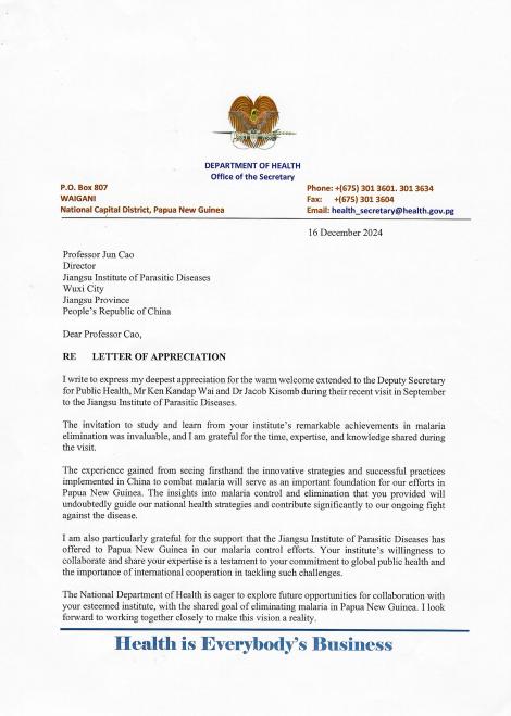 近日,江蘇省血吸蟲病防治研究所收到來自巴布亞新幾內亞衛生部的感謝信。信中感謝省血防研究所向巴布亞新幾內亞衛生部官員分享中國抗瘧經驗、技術和產品,以及來華訪問期間的精心準備與周到安排,期待在未來雙方能開展更加深入的合作。