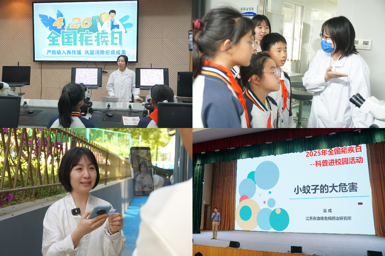 4月25日當天,一場別開生面的“探秘瘧疾防控”直播活動在研究所內展開。梅園小學15余名學生化身“小小科學家”,走進國內領先的蚊媒飼養室和鏡檢室,通過顯微鏡觀察瘧原蟲形態、了解蚊子生活史、親手體驗“吸蛹”等互動方式增長了知識。線上直播的創新形式更向社會傳遞了“嚴防輸入再傳播 鞏固消除瘧疾成果”的瘧疾防治理念。同時,瘧疾室專業人員走進無錫市新吳區麗景實驗學校,以科普講座、動畫演示和趣味問答等形式,讓100余名學生掌握防蚊滅蚊實用技能,在幼小心田播撒科學防病的種子。
