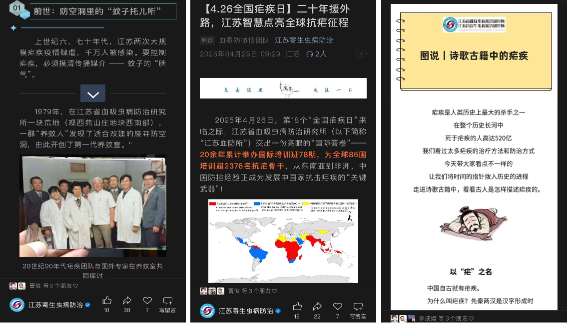 系列推文《從防空洞到實驗室,持續46年的人蚊大戰》以媒介實驗室的變遷為線索,展示了省血防研究所一群專業技術人員用46年書寫的“人蚊共生”的科研故事;《二十年援外路,江蘇智慧點亮全球抗瘧征程》回顧了研究所自2002年以來向80多個國家輸出中國瘧疾防控經驗的歷程,彰顯全球衛生治理中的江蘇擔當;《詩歌古籍中的瘧疾》則從文學視角切入,摘錄古今中外詩詞中關于瘧疾的記載,引發公眾對瘧疾與人文明關系的深度思考。