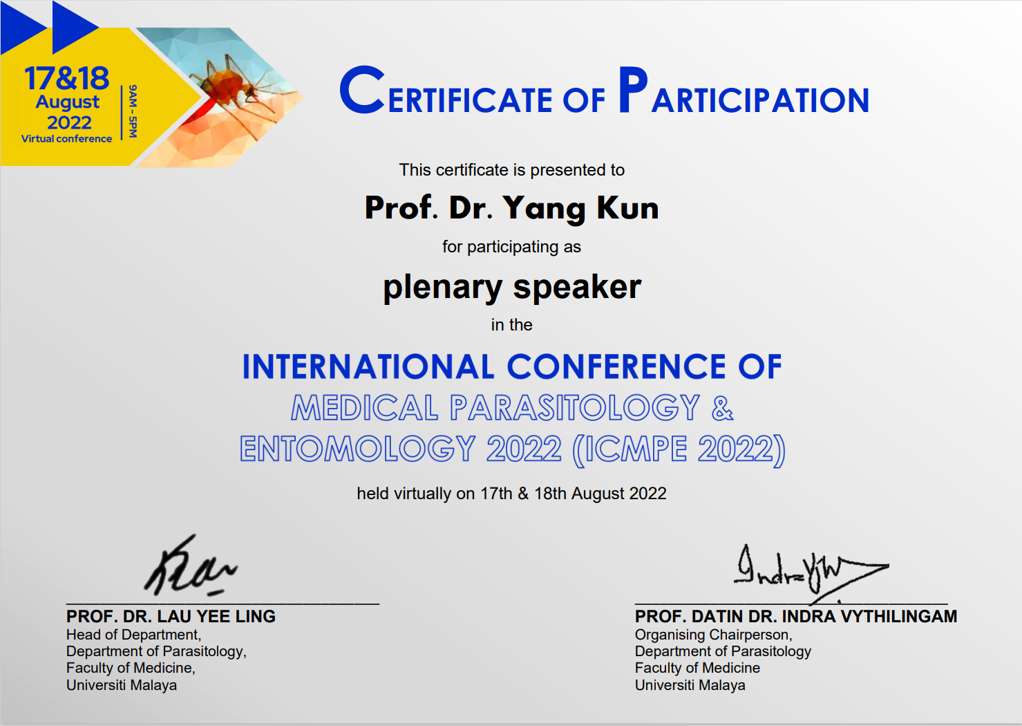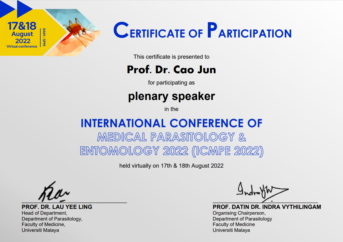 8月17-18日,由馬來(lái)亞大學(xué)舉辦的2022年國(guó)際醫(yī)學(xué)寄生蟲(chóng)學(xué)與昆蟲(chóng)學(xué)會(huì)議(ICMPE 2022)線上召開(kāi)。省血防研究所曹俊研究員和楊坤研究員應(yīng)邀出席了本次會(huì)議。
