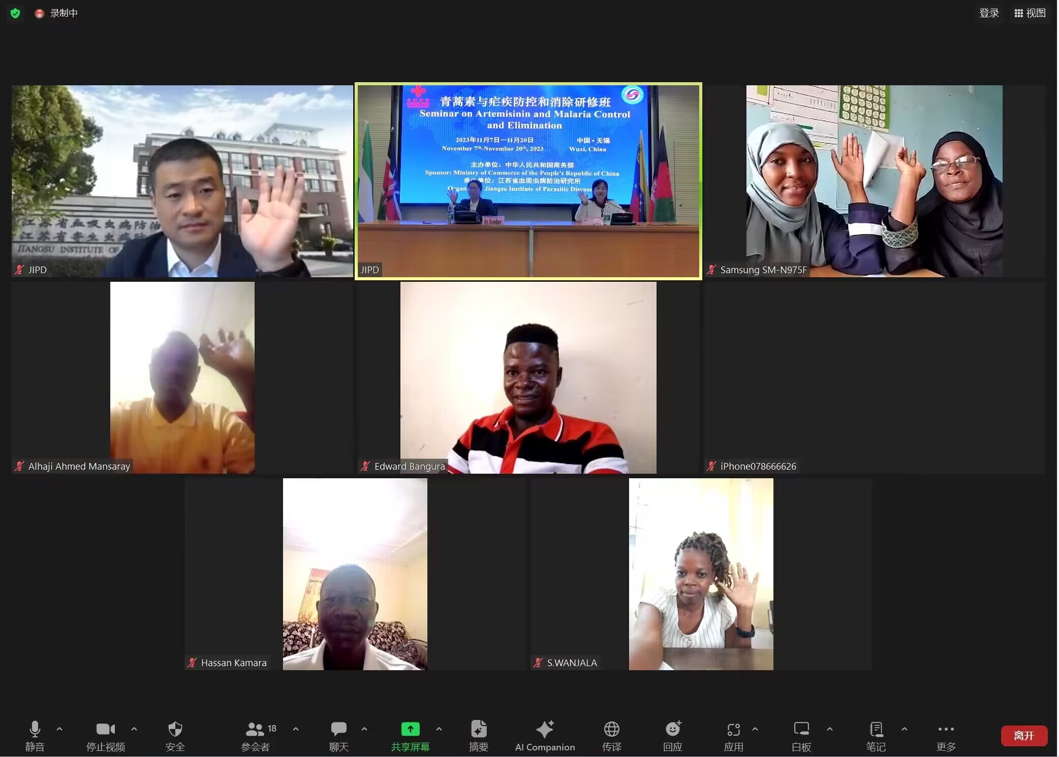本期研修班共計14天,采取線上方式進行,邀請了中國疾病預防控制中心、中華預防醫學會、復旦大學和江蘇省血吸蟲病防治研究所等從事瘧疾防控和消除、傳染病和公共衛生領域的專家進行授課。該研修班是省血防研究所承辦的年度最后一期援外人力資源培訓項目,旨在分享瘧疾防控策略和綜合治理的中國經驗、青蒿素類抗瘧藥物治療的中國方案,并提供國際合作的交流平臺,提升發展中國家瘧疾防控和消除能力,加強人才隊伍儲備和科研能力建設。
