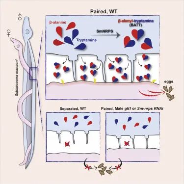 近日,由美國德克薩斯州西南醫學中心James J. Collins III團隊發表在《細胞》(Cell)雜志題為“A male-derived nonribosomal peptide pheromone controls female schistosome development”的一項研究,首次報道了血吸蟲雄蟲誘導的雌蟲生殖發育的分子機制,從而有助于回答一個世紀以來的謎題,為這種被忽視的熱帶病提供新的治療方法。