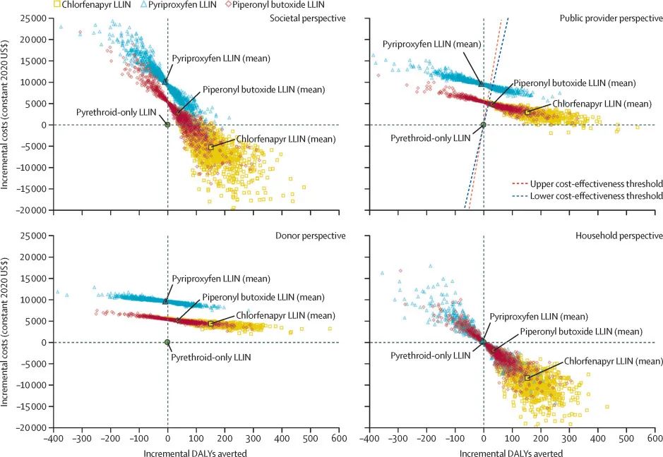 結果表明,與單獨使用α-氯氰菊酯LLINs對照組相比,使用雙活性成分蚊帳的試驗組瘧疾的發病率在2年內平均降低了44%。此外,長效殺蟲劑蚊帳發放2年后,使用氯蟲腈和α-氯氰菊酯LLINs實驗組兒童的瘧疾感染率為25.6%,而對照組為45.8%。雖然新型蚊帳的成本更高,但該試驗中的成本效益分析表明,相對于單獨使用α-氯氰菊酯LLINs,減少的傷殘調整生命年(DALY)所花費的成本低于合理的成本效益閾值。這為流行地區的瘧疾控制規劃以及捐助者提供了重要信息。
