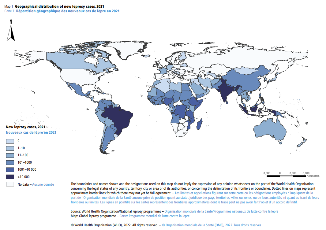 報(bào)告顯示:在全球范圍內(nèi),2021年底接受治療的病例數(shù)為133802例,患病率為每百萬人16.9例。其中,非洲區(qū)域20960例(每百萬人 18.0例)、美洲區(qū)域 25 053例(每百萬人24.3例)、東地中海區(qū)域 4206例(每百萬人5.5例)、東南亞區(qū)域81222例(每百萬人39.4例)和西太平洋區(qū)域 2360例(每百萬人1.2例)。另外,全球還報(bào)告了9052例新的兒童病例,與 2020年(8642例)相比有所增加,其中,62.6%的兒童病例來自東南亞區(qū)域。兒童新病例的增加表明傳播呈增加態(tài)勢。