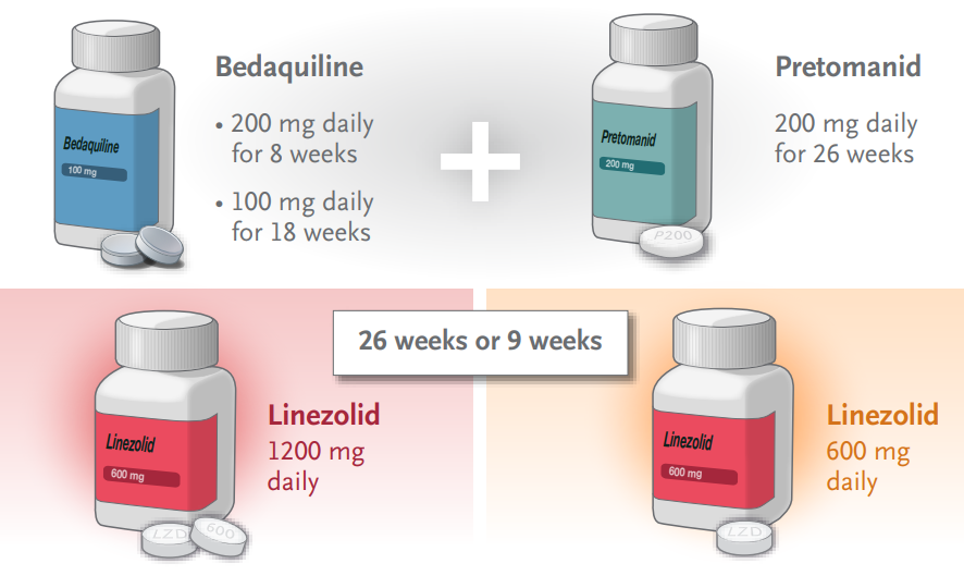 該研究對181名廣泛耐藥(XDR)結(jié)核病(即對利福平、氟喹諾酮類藥物和氨基糖苷類藥物耐藥)、前XDR結(jié)核病(即對利福平和氟喹諾酮或氨基糖苷類藥物耐藥)或?qū)χ委煙o反應(yīng)的利福平耐藥結(jié)核病或因副作用而停止二線治療方案的受試者,隨機(jī)分配參與者接受貝達(dá)喹啉、普瑞瑪尼和利奈唑胺治療。