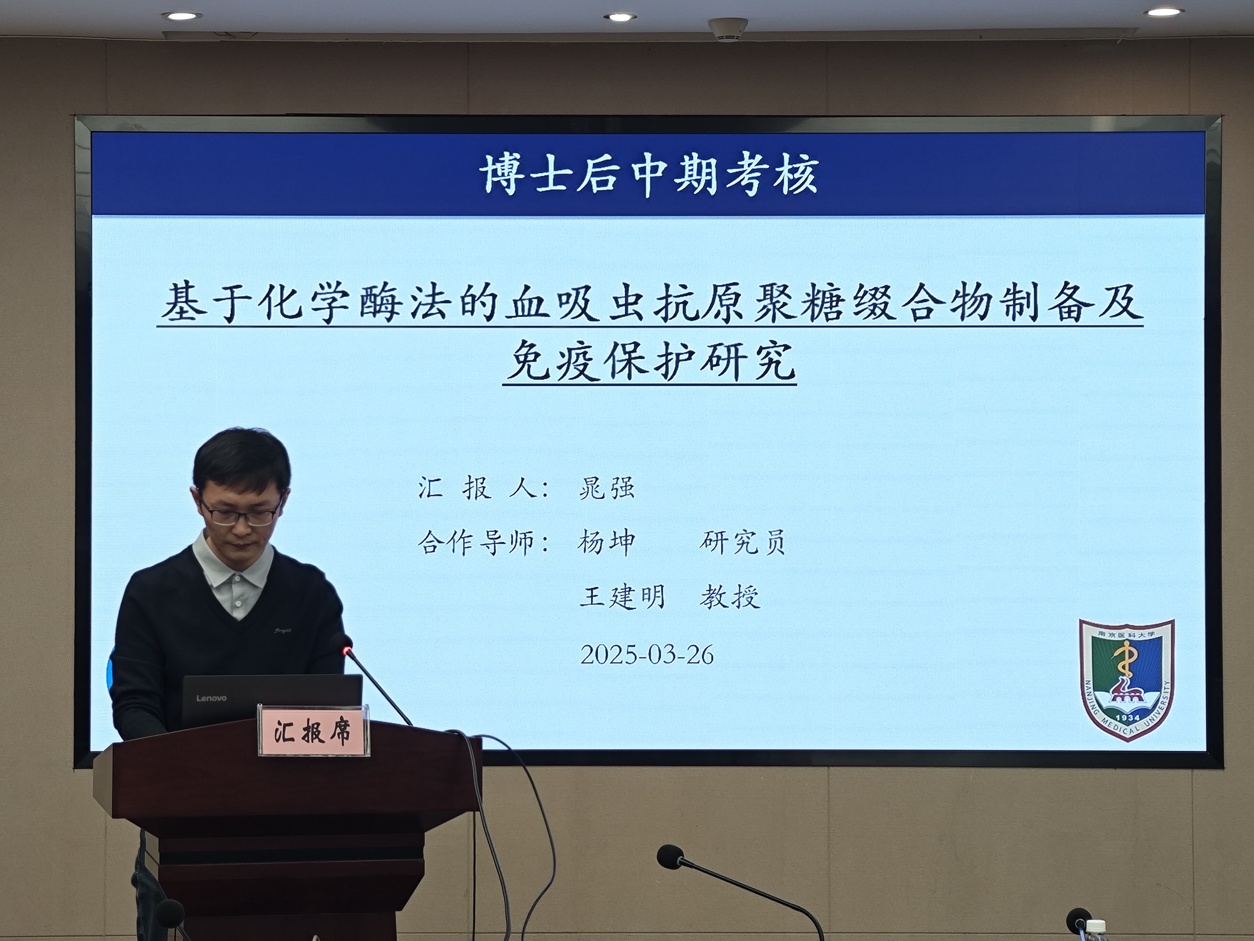 會議上,晁強博士匯報了課題《基于化學酶法的血吸蟲抗原聚糖綴合物制備及免疫保護研究》,詳細闡述了研究內容、技術路線、已取得的階段性成果以及后續研究計劃。專家組在聽取匯報后,對研究項目進行了充分討論,并針對項目中存在的問題提出了具體的改進建議,一致同意通過中期考核。