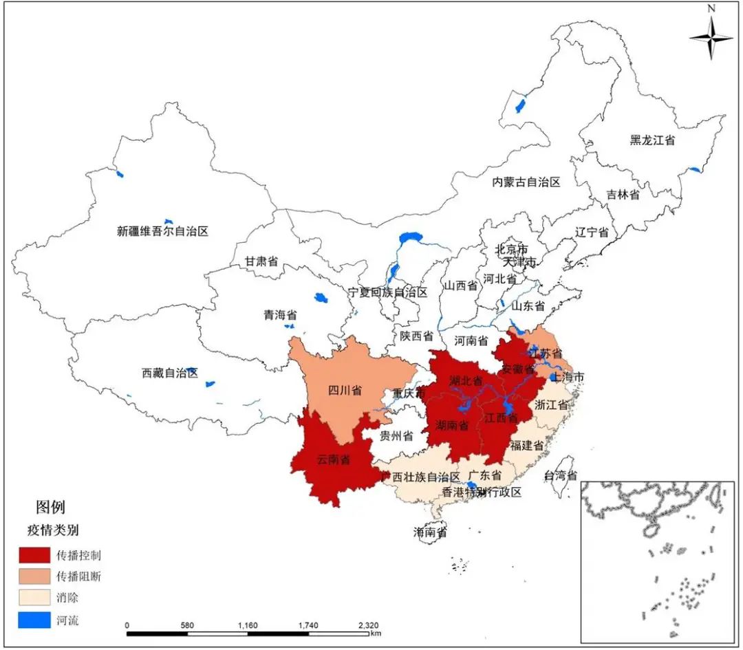 2020年,全國實有釘螺面積364950.24 萬平方米,其中47.27%分布在湖南省,22.91%分布在江西省,19.48%分布在湖北省,7.19%分布在安徽省,2.32%分布在四川省,0.83%分布在其余7個流行省份(上海、江蘇、浙江、福建、廣東、廣西、云南)。