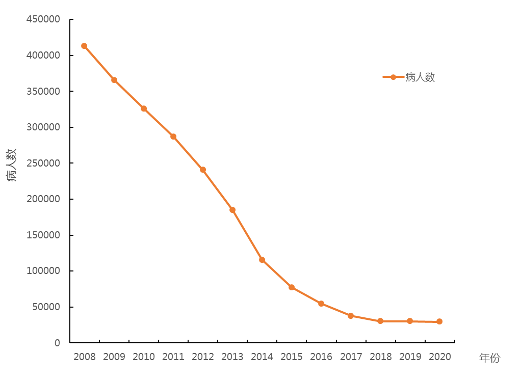 2008-2018年,我國血吸蟲病病人數逐年下降。至2018年后,病人以晚期血吸蟲病病人為主。2020年全國現有血吸蟲病病人29522 例,其中99.98%為晚期血吸蟲病病人,主要分布于湖南、湖北、江西、安徽、江蘇、云南、四川等7個省。