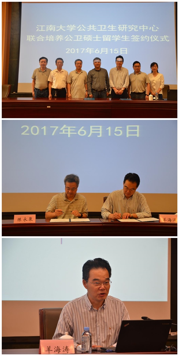 6月15日上午,我所與江南大學醫學院聯合培養公共衛生與預防醫學碩士留學生簽約儀式在醫學院學術報告廳舉行。江南大學副校長徐巖,國際教育學院院長曹棟,醫學院黨委書記周建、院長陳永泉,我所所長羊海濤、副所長梁幼生、科教科王玠科長出席了儀式。