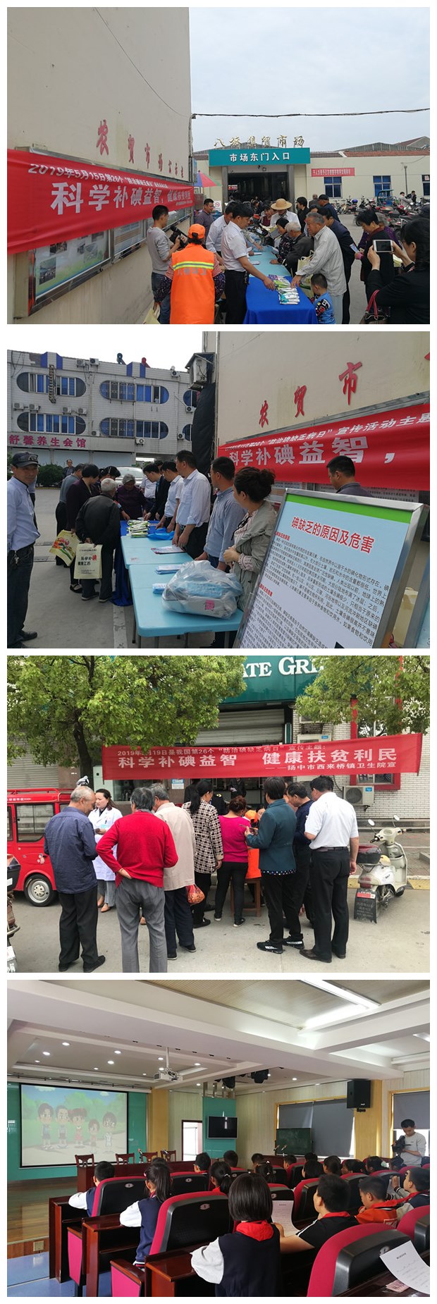 2019年5月15日是我國第26個“防治碘缺乏病日”,為營造全社會共同參與防治碘缺乏病氛圍,5月15日,揚中市疾控中心、市市場監督管理局、市鹽業公司、八橋中心衛生院聯合在八橋鎮農貿市場舉辦了主題為“科學補碘益智,健康扶貧利民”宣傳活動,現場設立宣傳展板6塊,橫幅1條,發放宣傳單(手冊)近300余份,發放無紡布袋、筆袋等宣傳用品近200份。活動現場,市疾控中心、市市場監督管理局和市鹽業公司專業人員向過往群眾講解碘缺乏的危害、缺碘與智力的關系、如何判定體內缺碘、如何判定真假碘鹽等問題,還到學校開展了碘缺乏病防治知識講座,進行了防治碘缺乏病知識測試。當日,各鎮(街、區)也開展了形式多樣的宣傳活動,累計發放宣傳單(手冊)800余份,設立展板30余塊,懸掛橫幅6條,播放碘缺乏病宣傳片6場次。